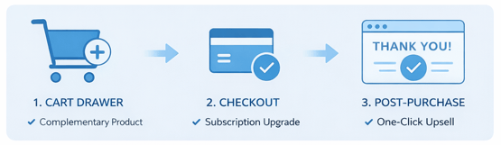 This moment is typically underutilized. Many brands rely on post-purchase email flows to introduce additional products or subscription upgrades. By that stage, intent has already declined, and conversion rates drop significantly. In contrast, introducing upsells directly in the cart, at checkout, or immediately after purchase captures demand while the customer is still actively engaged.