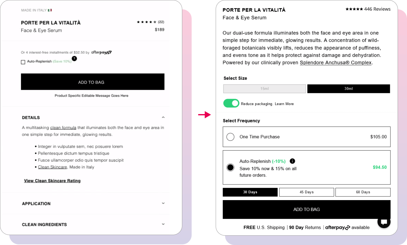Furtuna Skin is a luxury regenerative skincare brand with an auto-replenishment subscription offer. As the brand grew, subscriptions werenʼt keeping pace with overall awareness because the enrollment experience and subscriber journey felt clunky and inconsistent with a premium aesthetic. The subscription option was hard to find, the widget was limited, and the experience created friction that hurt conversion.