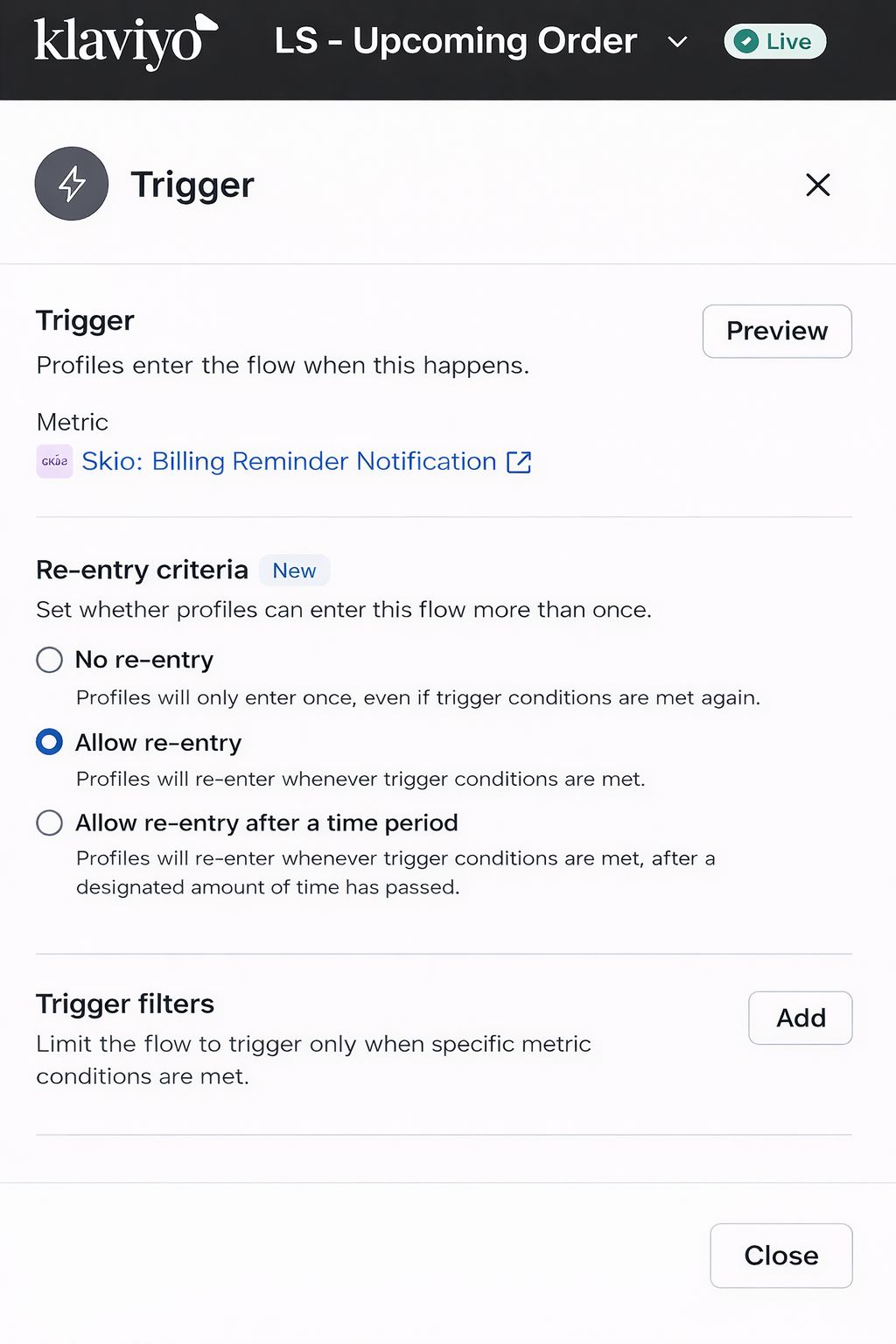 Implementation typically occurs inside Klaviyo’s flow builder using the billing reminder event generated by the subscription platform. The trigger event, such as Skio’s Billing Reminder or Recharge’s Upcoming Charge, includes a property that indicates how many subscription cycles have already been completed. This value can be used in trigger splits to route subscribers into the correct branch.